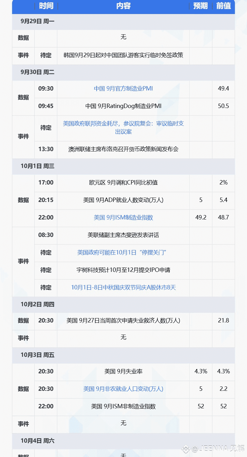 3. September 30 (Monday): China will release the official manufacturing PMI data for September. The market is关注 whether it can return to the expansion range and the recovery situation on the demand side.