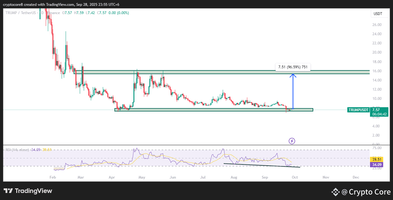 This TRUMPUSDT chart shows the price holding strong at the support zone with a bullish divergence on the RSI. The blue arrow signals a possible rise toward the resistance area, nearly doubling in value, suggesting a strong bullish move ahead.
