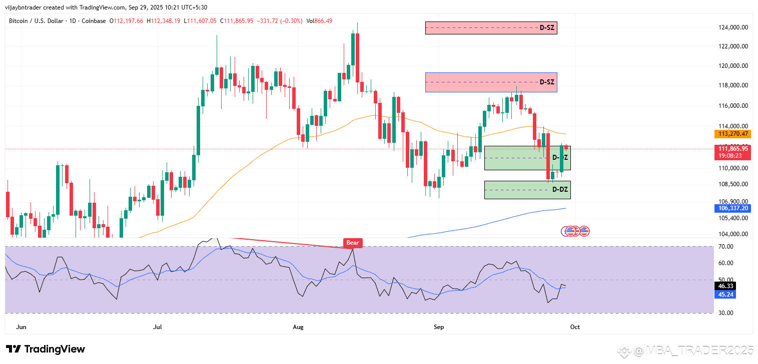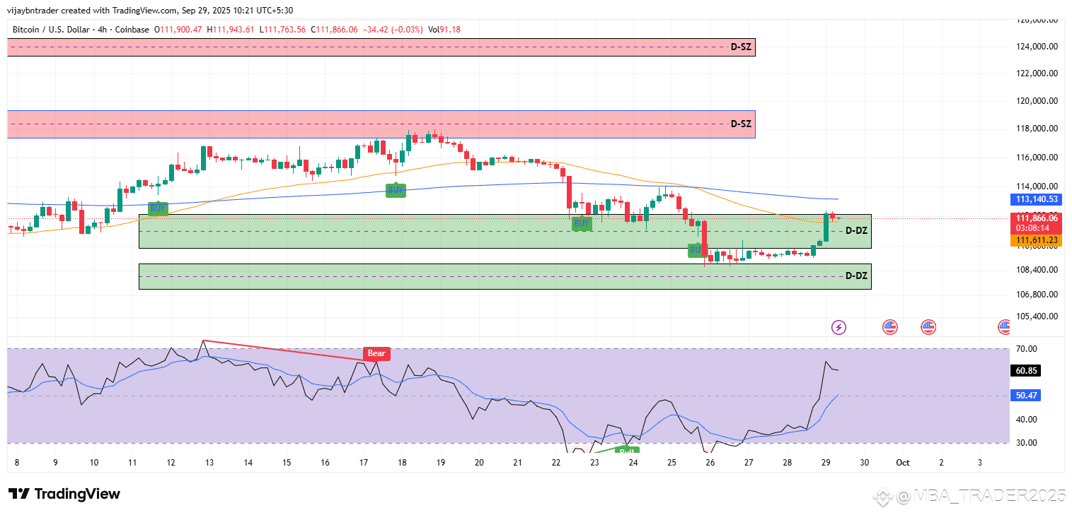 Zones: Yesterday’s low tagged the upper daily demand at 112.4k–110.5k and bounced, but the path is still capped beneath 113.3k–114.0k and the broader 117.8k–119.5k supply band.