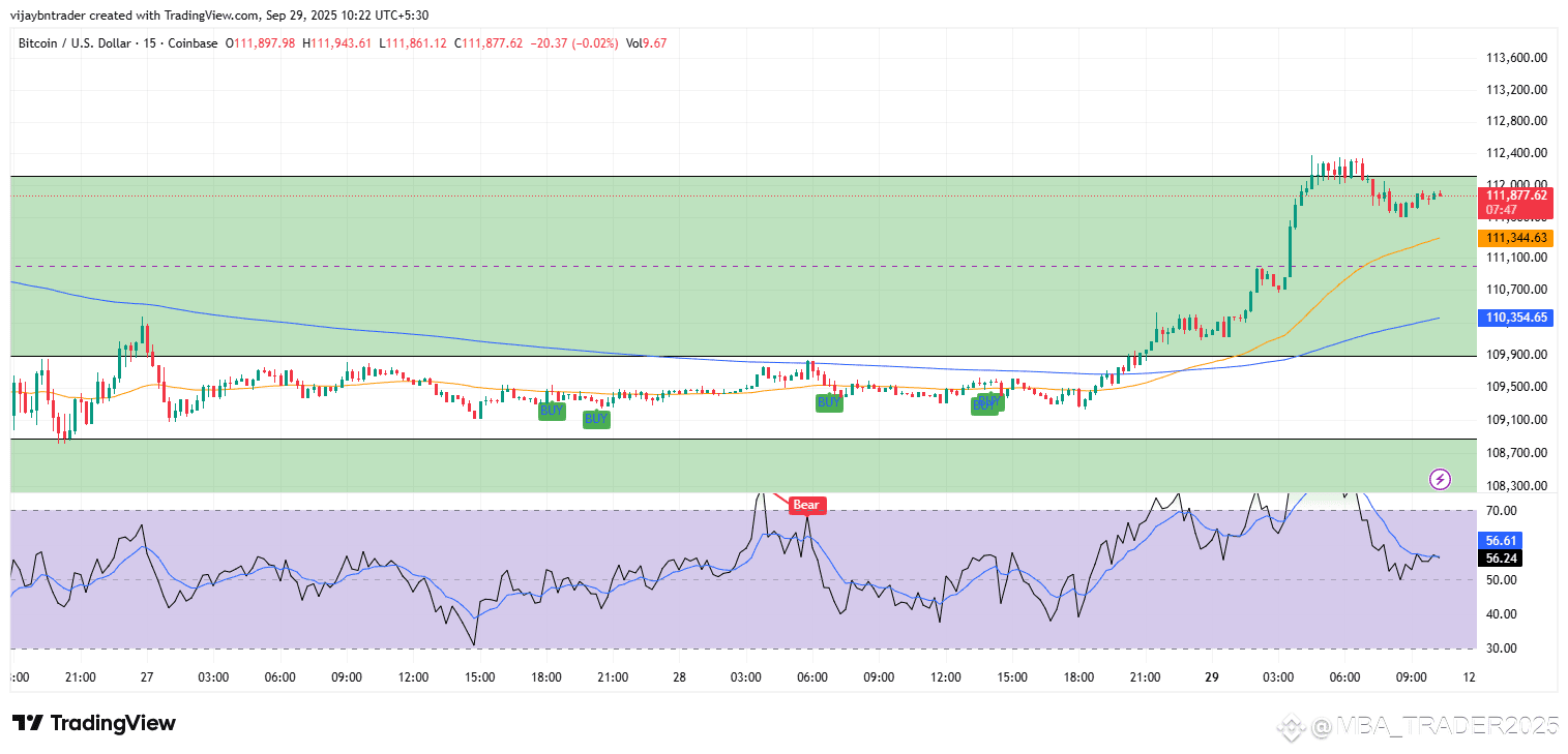 Momentum continuation long: 15m/1h close ≥112.2k, buy the retest that holds ≥112.0k with RSI >50, targets 112.9k then 113.3k–113.6k, trail below 112.0k or 1h EMA.