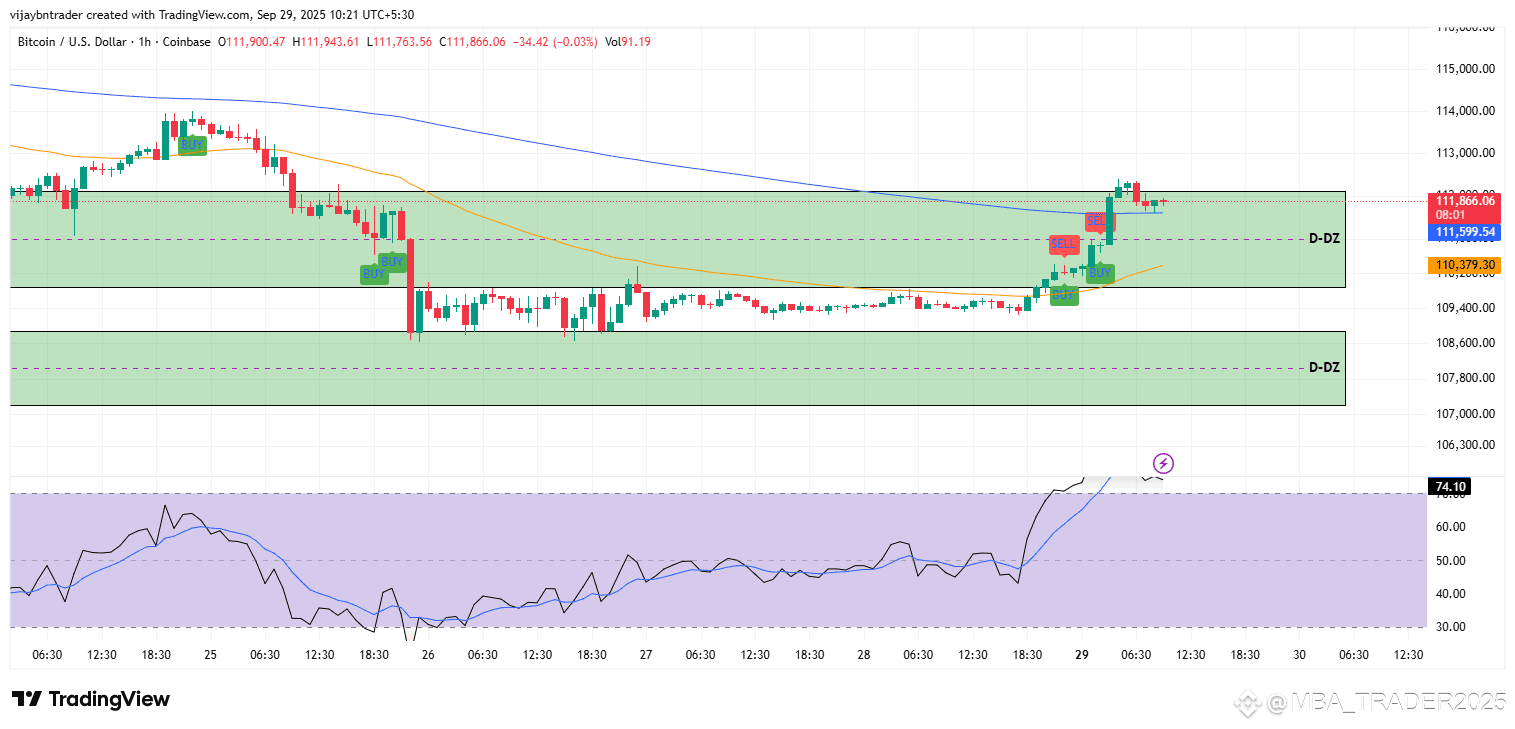 Map: Price reclaimed the 1h EMA ribbon and is probing the upper demand box at 111.6k–112.0k, with the 200‑type MA overhead near ~112.5k acting as the first gate.