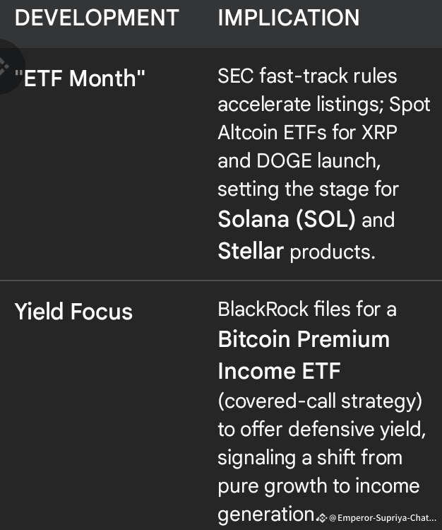 Altcoin ETF Fast-Track: Following the SEC’s approval of general listing standards, the first Spot Altcoin ETFs for XRP and Dogecoin (DOGE) have launched, with filings for Solana (SOL) and Stellar now accelerating. October is deemed "ETF Month" due to numerous pending decisions.