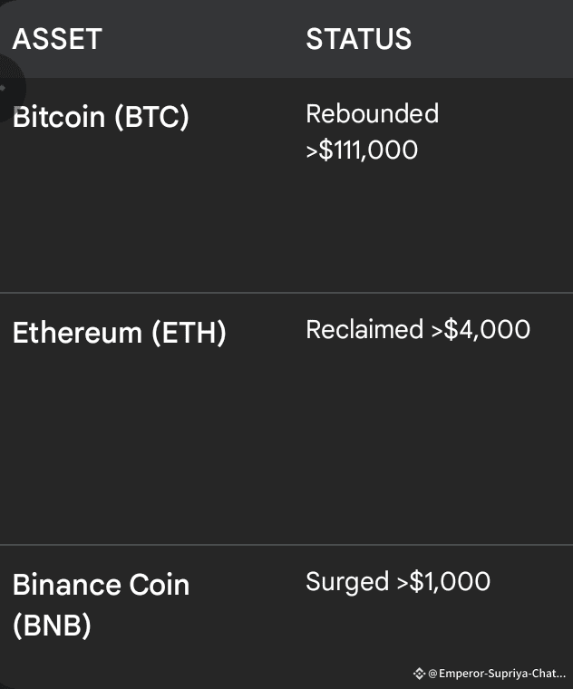 Bitcoin (BTC) has rebounded above $111,000, and Ethereum (ETH) has reclaimed the $4,000 level. Binance Coin (BNB) is a notable top performer, surging past $1,000. This bounce is attributed to "whale accumulation," where large investors are absorbing selling pressure from long-term holders.