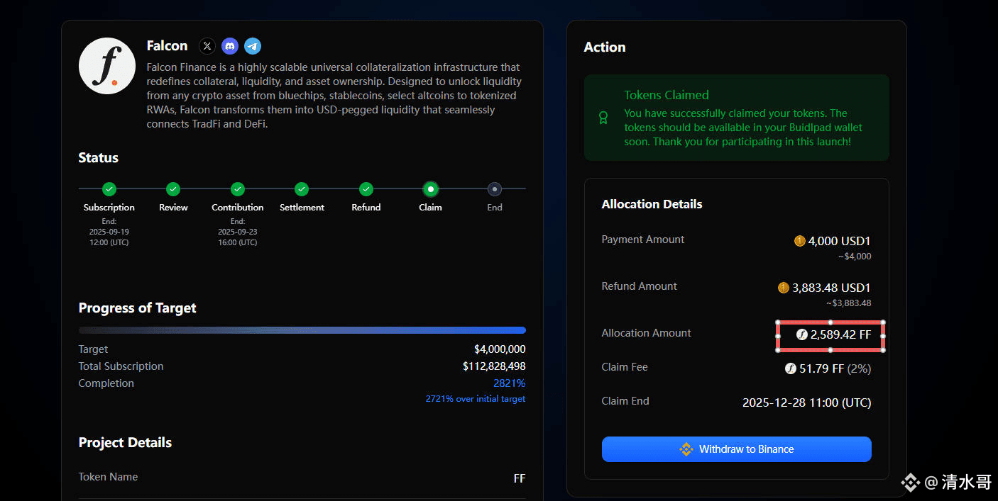 一周前在Buidlpad平台参与的Falcon项目的一级打新,今天出结果了,按目前FF代币的市场价算,单号净利润862美元(6100元),大约抵得上三四线城市一个月工资了,多号参与的更是挣麻了。