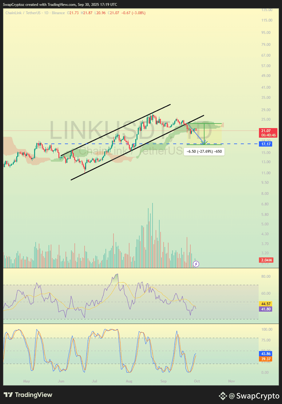 Chainlink has broken its rising channel and is now moving downward. If selling pressure continues, price could drop toward $17 support. Momentum indicators also show weakness, signaling more downside risk.