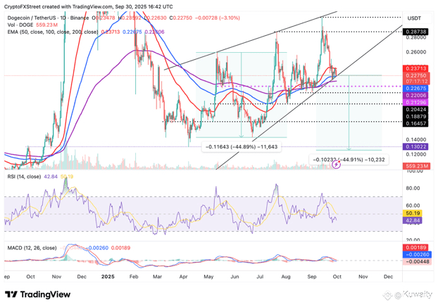 يواجه دوجكوين (DOGE) هيكلًا فنيًا ضعيفًا، حيث يتم تداوله دون 0.2300 دولار يوم الثلاثاء. تعكس النظرة الهبوطية قصيرة الأجل للعملة الميمية شعورًا متزعزعًا في سوق العملات المشفرة الأوسع قبل أكتوبر.