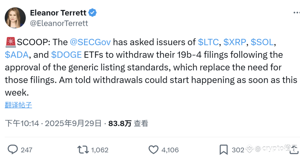 据加密记者Eleanor Terrett 披露,美国SEC 已要求LTC、XRP、SOL、ADA 和DOGE ETF 的发行方撤回其19b-4 文件,因为在通用上市标准获批后,这些文件已不再需要。