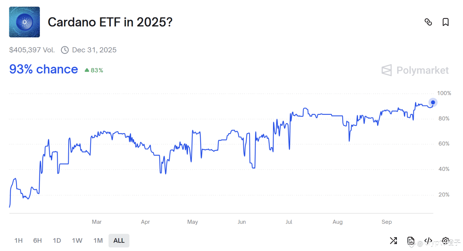 值得一提的是,ADA 为10 月末最后一个等待裁决的币种,Polymarket 上市场押注其ETF 获批的机率升至93%。