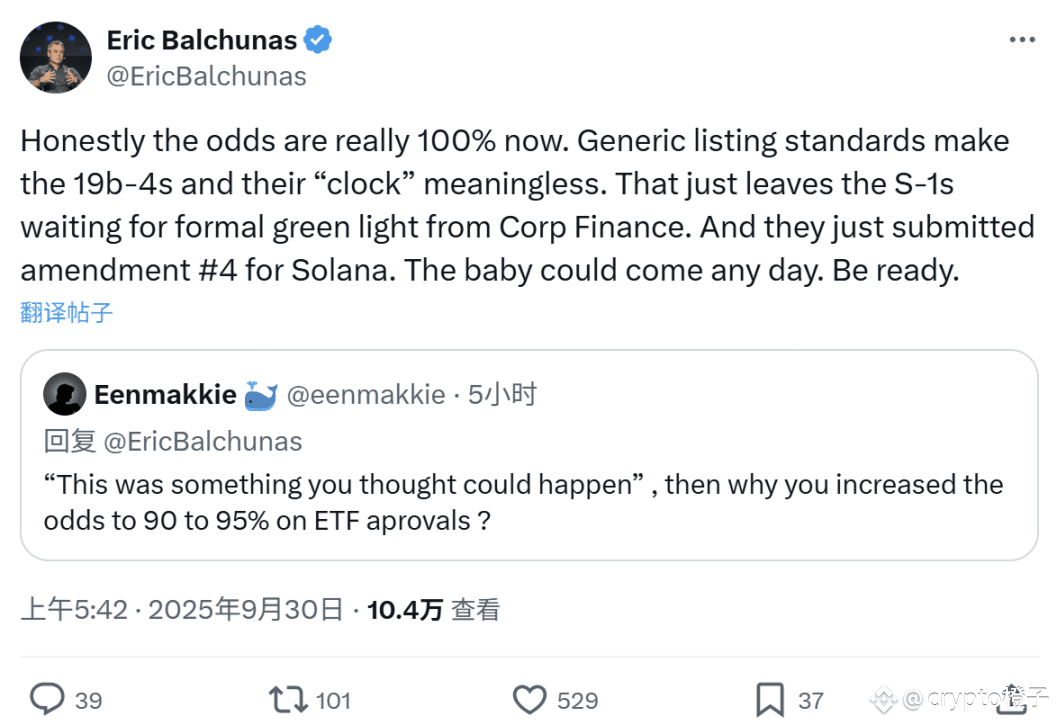针对SOL 的现货ETF 情况,彭博ETF 分析师Eric Balchunas 表示,「说实话,SOL 现货ETF 获批的成功率现在接近100%。通用的上市标准让19b-4 文件及其时间节点变得毫无意义,现在就只剩下S-1 表格相关事宜了。孩子随时都可能出生,做好准备吧。」
