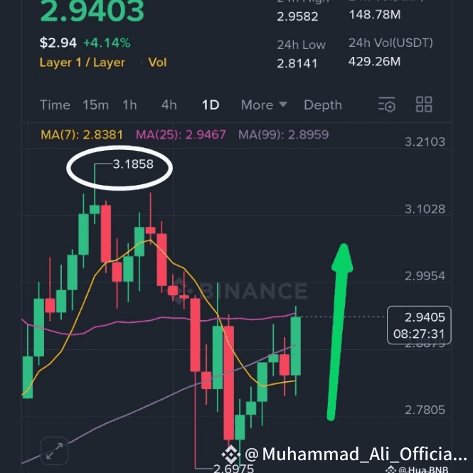 MA Crossover Confirmation: The shorter-term Moving Average (MA) looks ready to cross back above the longer-term MAs, specifically the MA(7) at 2.8381 is trending up aggressively towards the MA(25) at 2.9467. A confirmed golden cross in the near future will pour rocket fuel on this rally.
