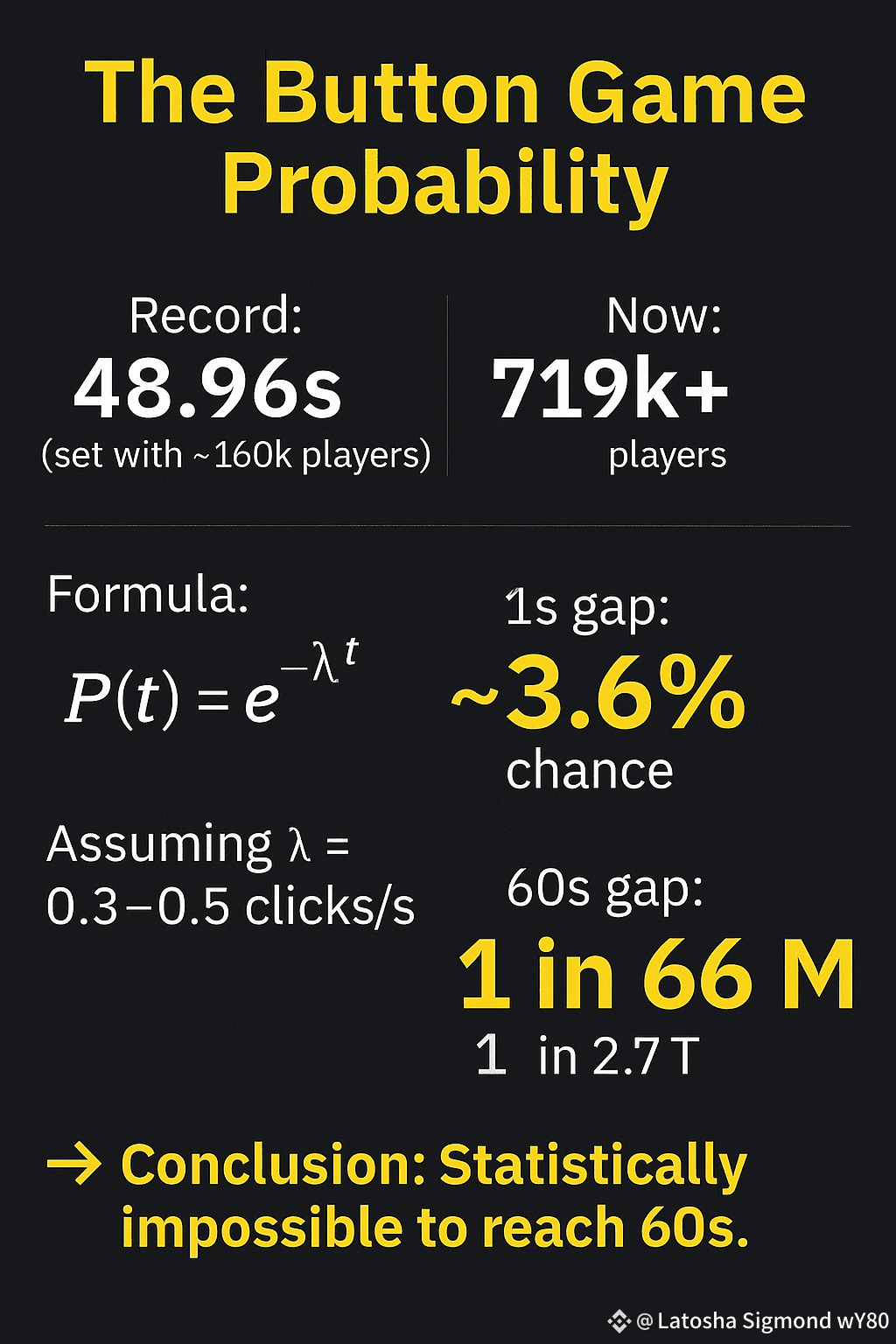 To estimate the likelihood of the timer reaching 60 seconds, we apply a Poisson distribution model, assuming an average click rate (λ) between 0.3 and 0.5 clicks per second. This assumption is consistent with empirical observations, where the timer rarely decreases more than 2–3 seconds before being reset.