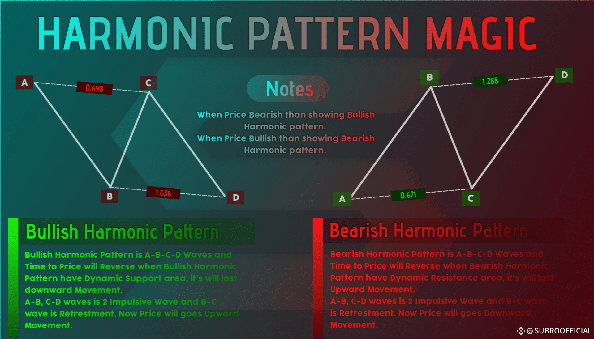 Bullish Harmonic Pattern is A-B-C-D Waves and Time to Price will Reverse when Bullish Harmonic Pattern have Dynamic Support area, it's will last downward Movement. A-B, C-D waves is 2 Impulsive Wave and B-C wave is Retrestment.