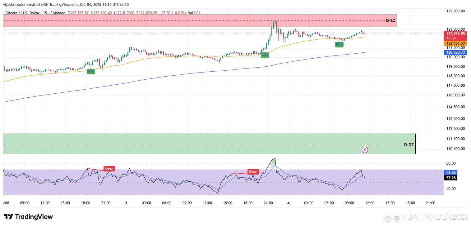 Tactical fade: While price stays capped under 123.0k and 15m/1h RSI can’t hold >50, fade into 122.6k–122.9k with tight risk above 123.1k; cover 122.0k → 121.2k, extend to 120.5k if RSI rolls under 50.