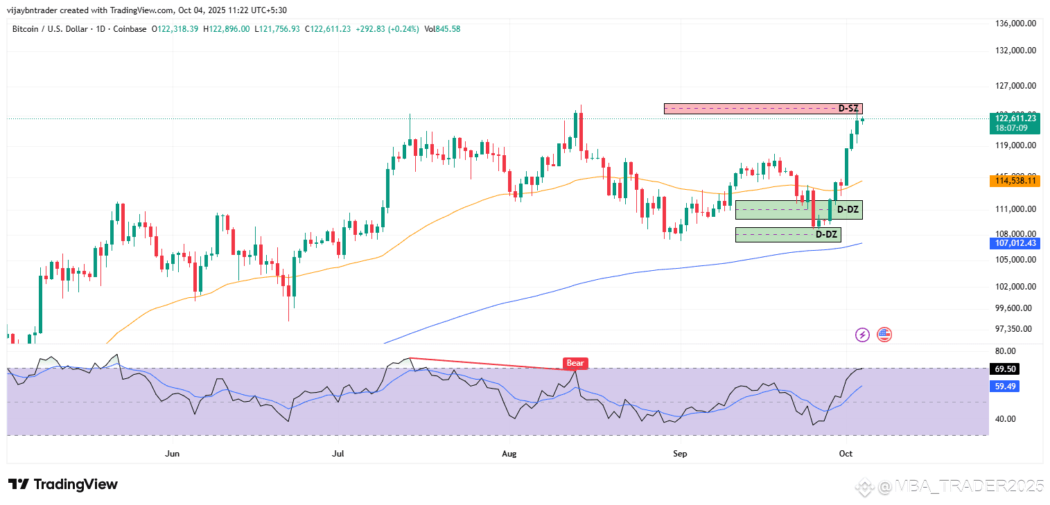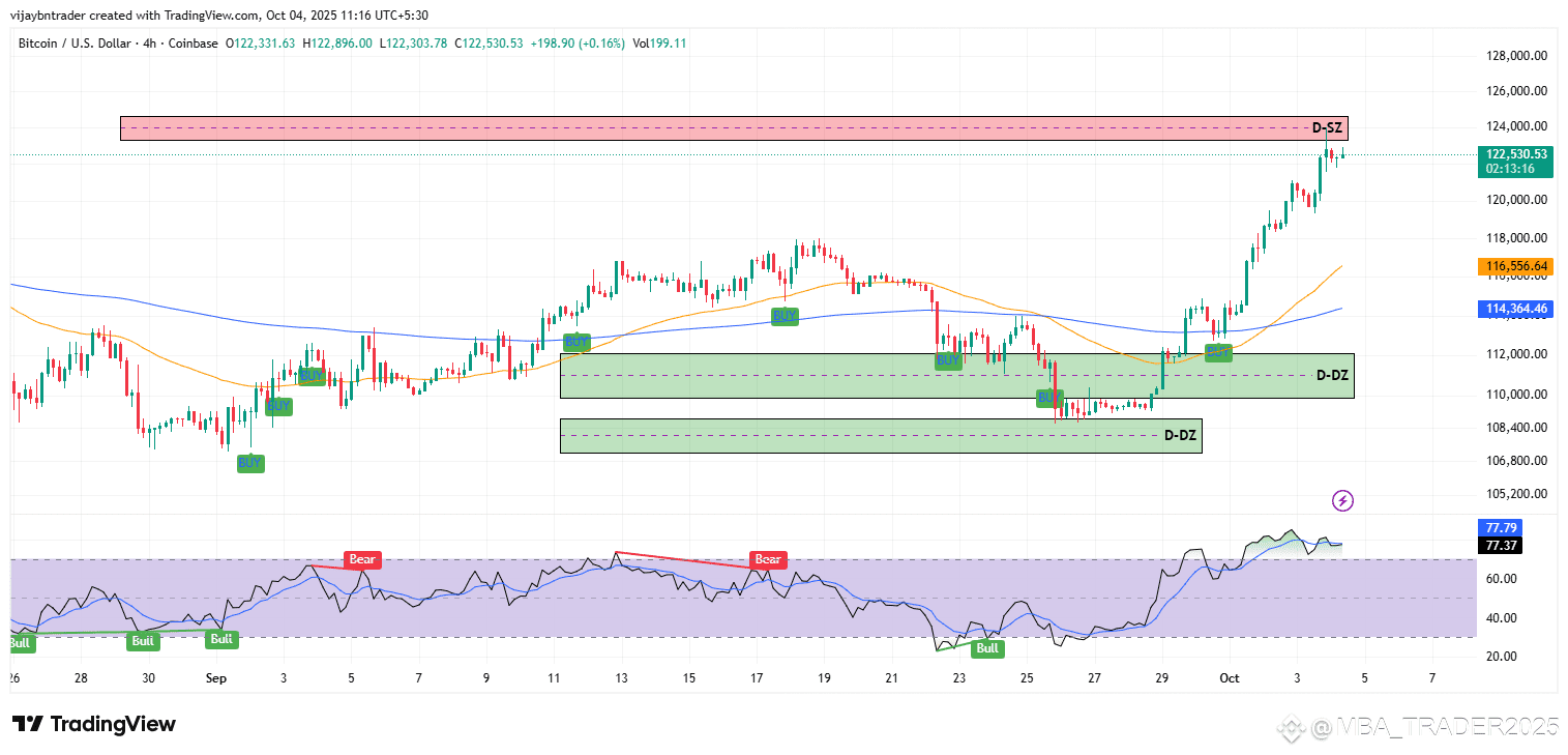 Trigger discipline: Use break‑and‑retest entry logic to filter fakeouts at the supply edge—close through 122.9k–123.0k, retest holds ≥122.6k, then ride toward 123.8k–124.5k.