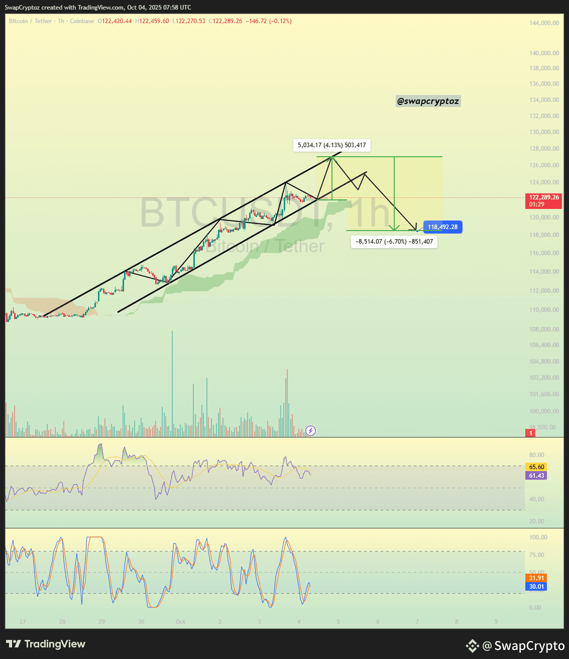 Bitcoin has been moving up in a channel, but this chart predicts it will top out soon. Expect a small, final push higher, followed by the price breaking down sharply to the $118,500 area.