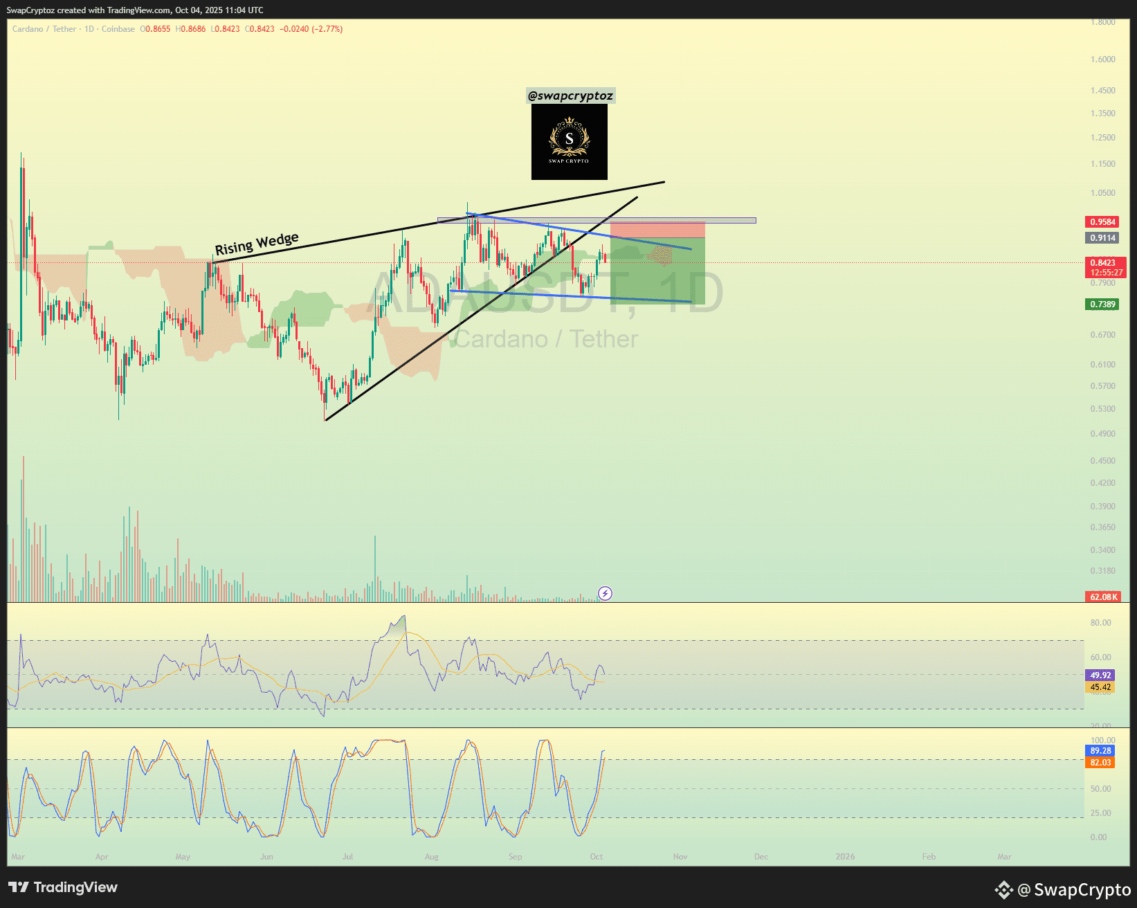 This chart shows ADA is in a rising wedge, which usually signals weakness. The price is struggling to break higher and indicators also look tired, so chances are big that ADA/USDT will break down and fall soon.