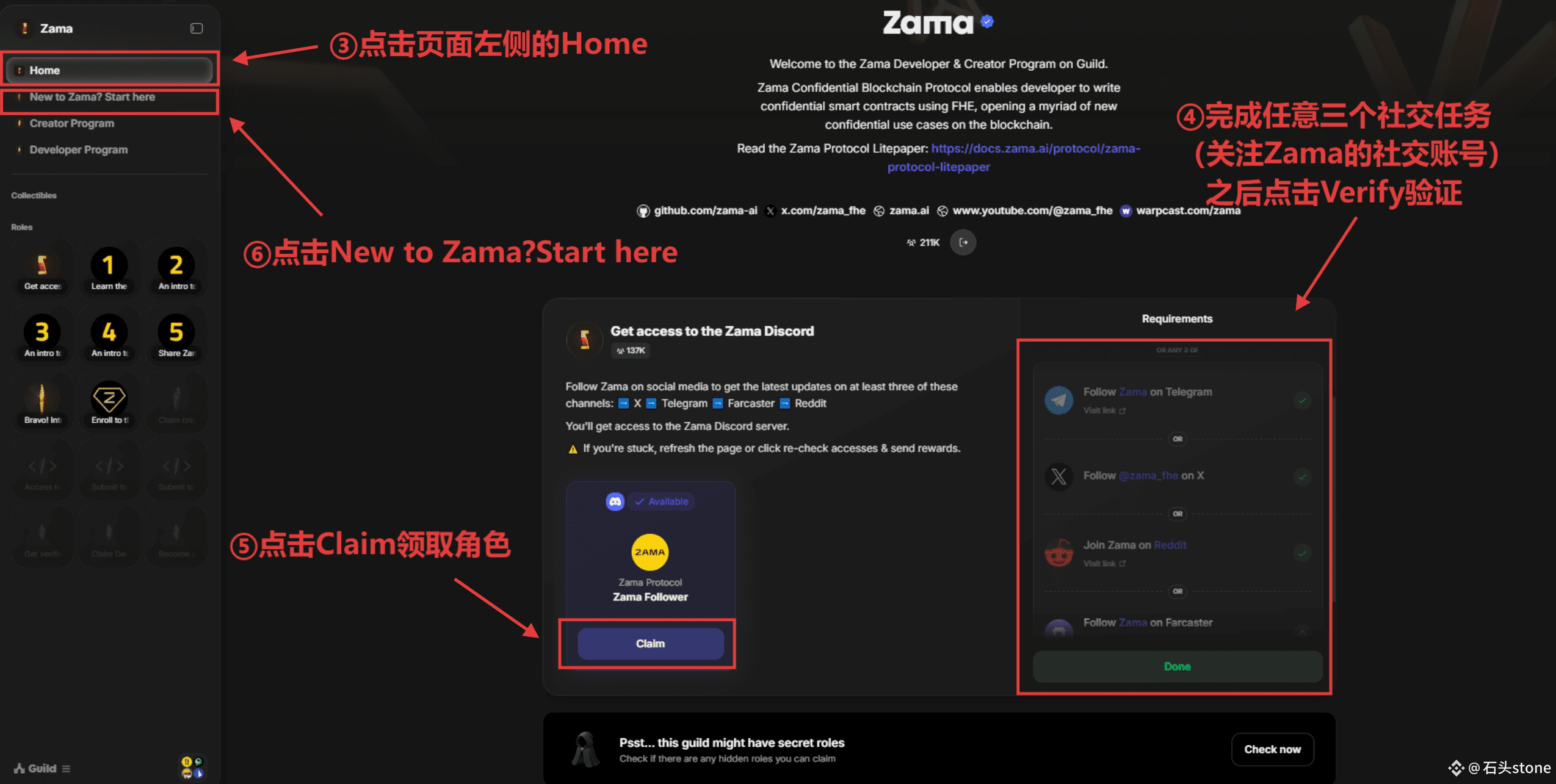 然后点击页面左侧的Home,在社交媒体上关注 Zama:➡️X ➡️Telegram ➡️Farcaster ➡️Reddit,
