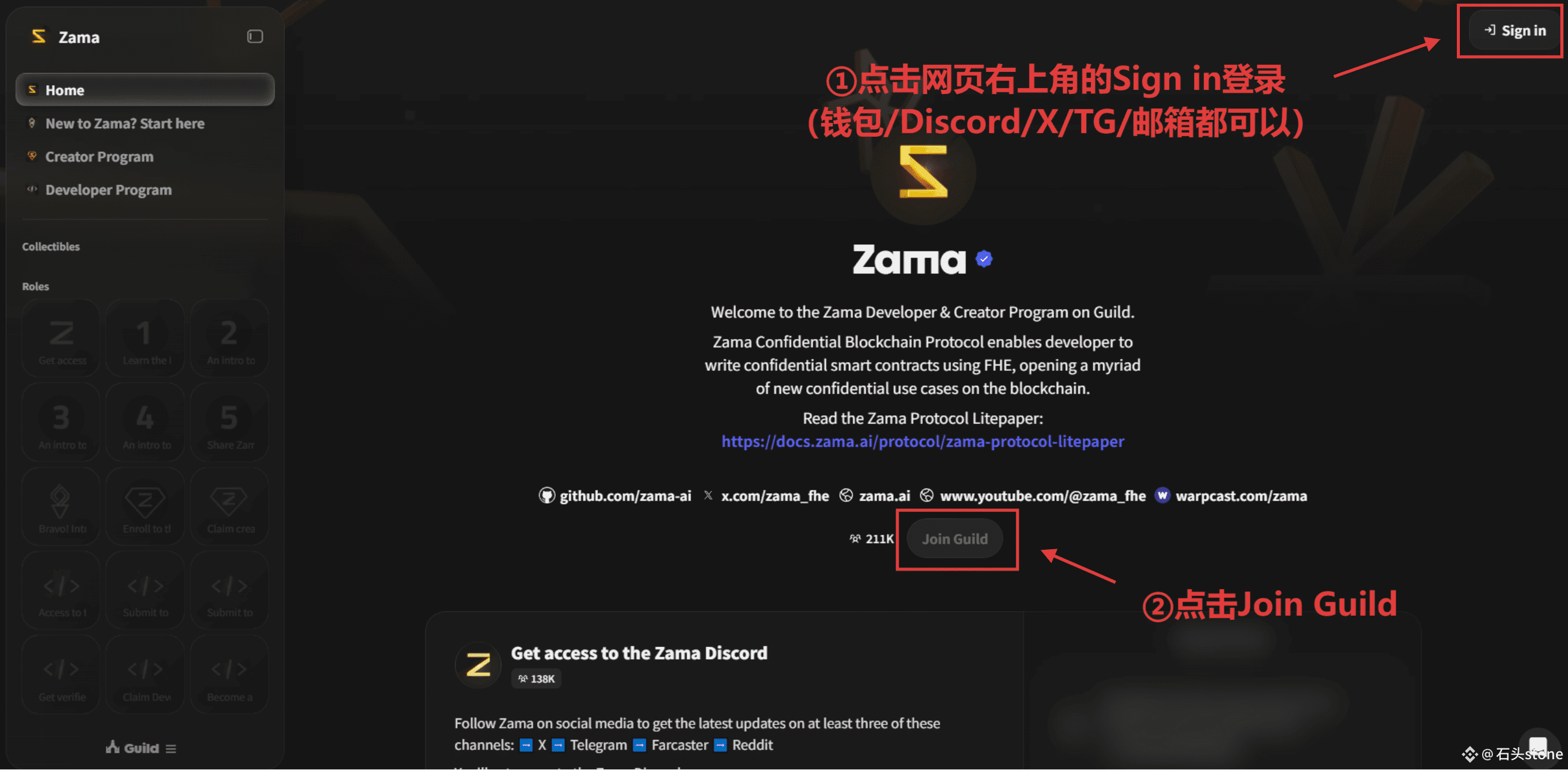 点击网页右上角的 Sign in 登录(钱包、Discord、X、TG、邮箱都能登录),然后点击 Join Guild