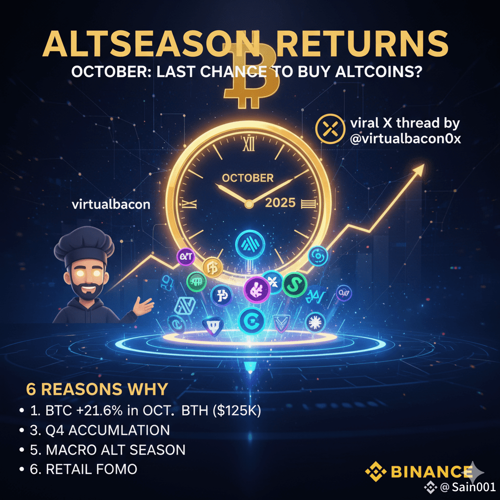 Crypto analyst VirtualBacon has sent shockwaves through the market with a viral X thread, telling his 227,000 followers that October 2025 could be the final opportunity to buy altcoins before the next major rally.