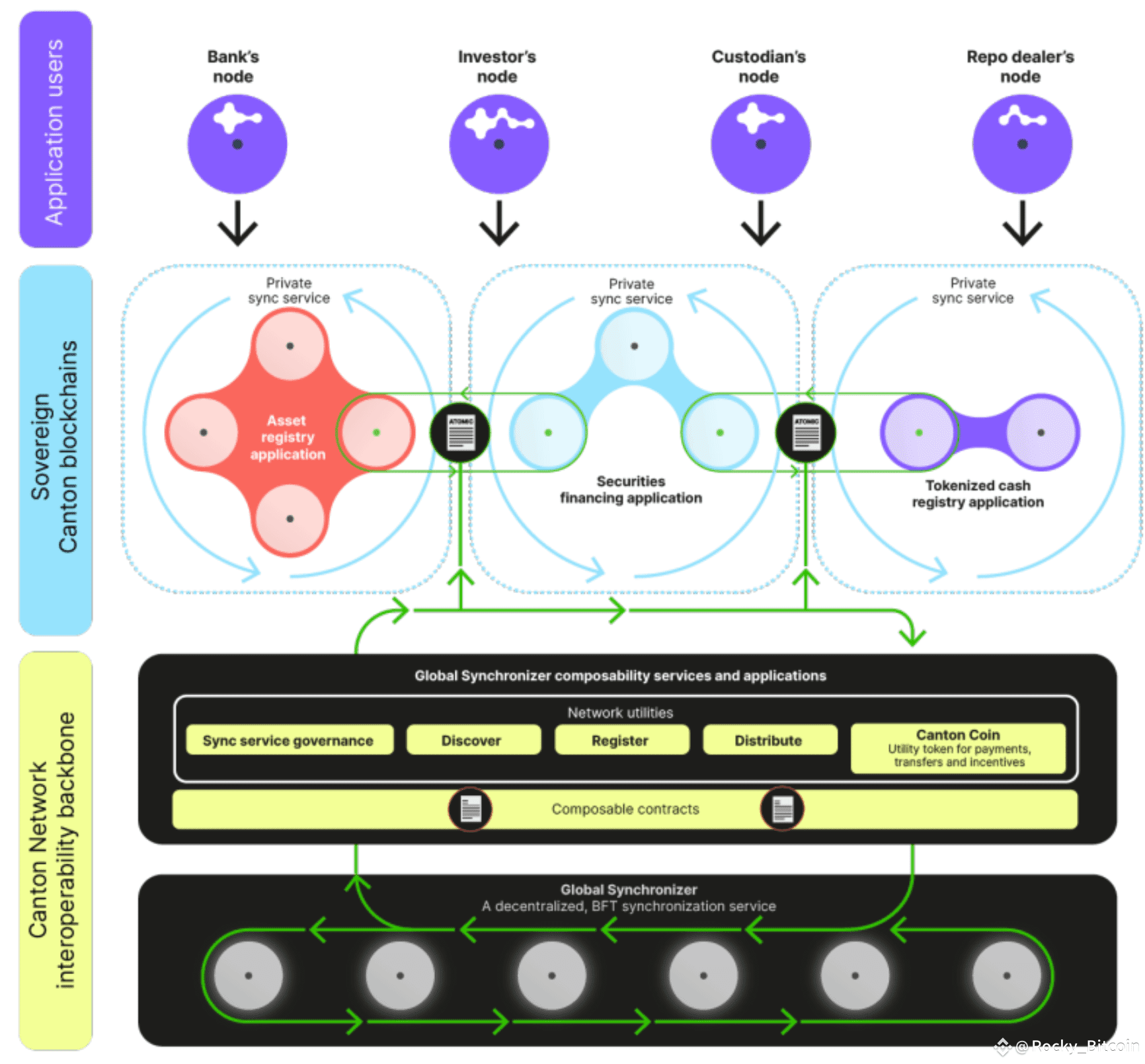 技术上,#Canton 采用了,双层共识机制(two-tier consensus);Global Synchronizer 全球同步器(提供跨时区即时结算);无限水平扩展性(network of networks 架构)等核心技术。这使它能在保持隐私与合规的前提下,支撑类似 NASDAQ 或 SWIFT 级别的吞吐量。