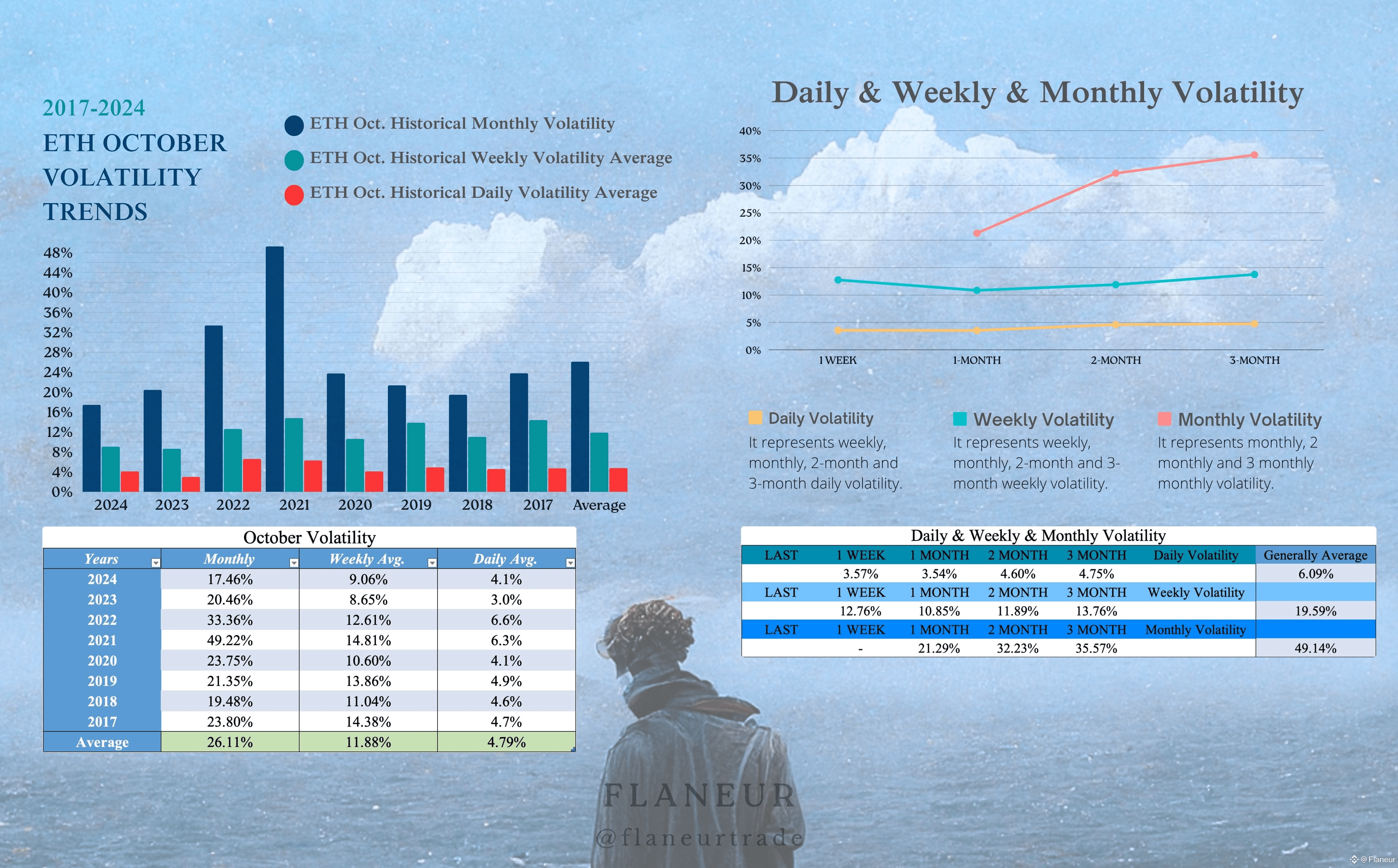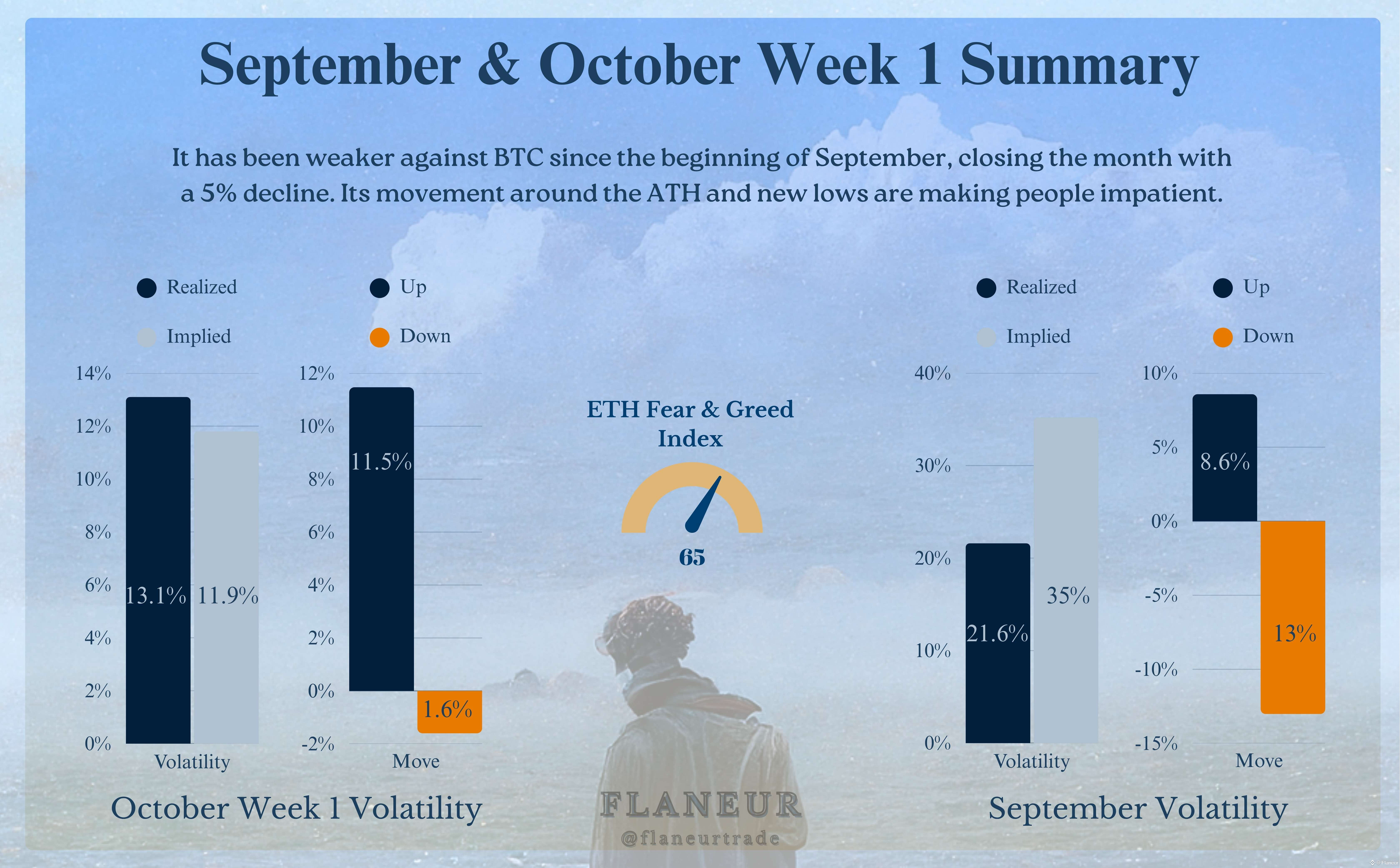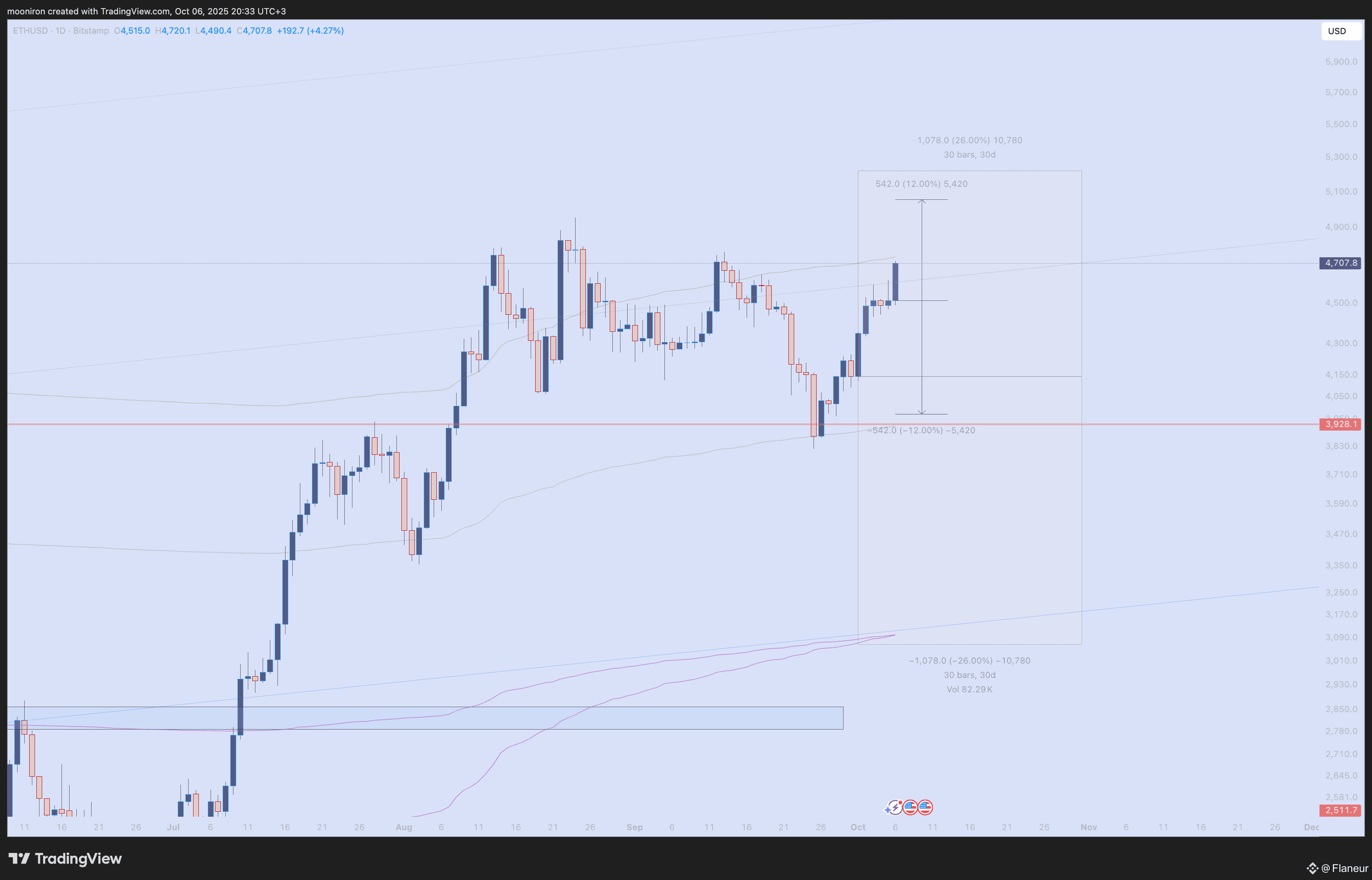For October, ETH’s historical averages show 26% monthly volatility and 12% weekly volatility. With a monthly open at $4,150, this implies a range of $3,000 to $5,200. The weekly open at $4,500 suggests a narrower band of $4,000 to $5,000.