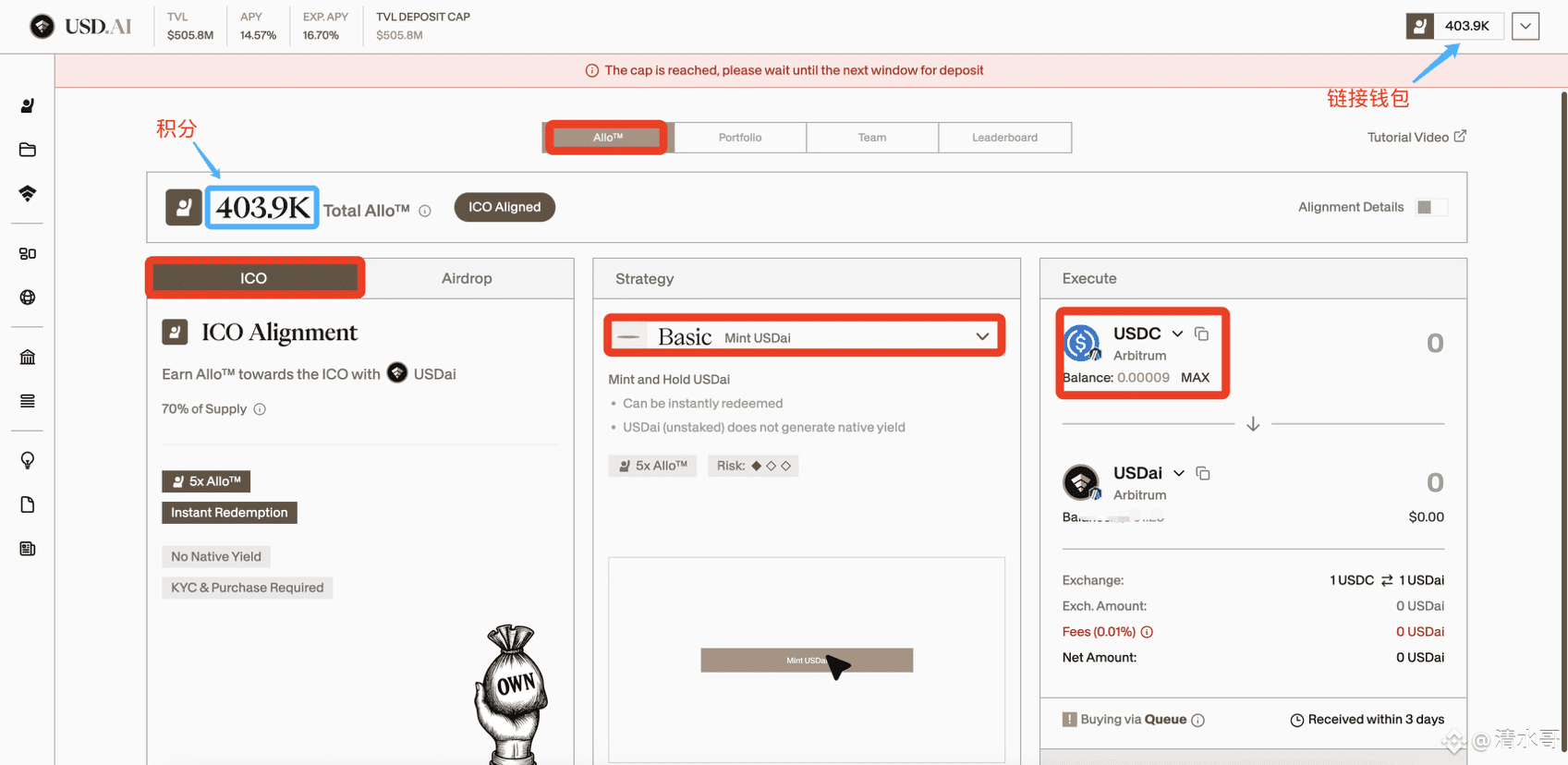 不过还是聊了这个USDai,8号晚上12点,USDai又开启新一轮存款了,之前参与过几轮了,这次给了总额度一亿美元,存ARB链的USDC,年化14%,锁仓7天,7天后可提取,但提现需要7天才到,存入的USDC,除了有年化14%利息外,还有积分,积分是未来能获得空投的重要依据。