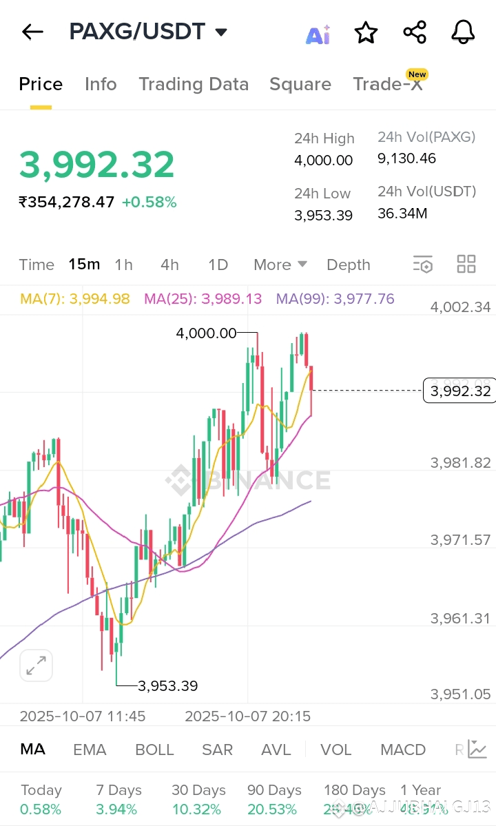 $PAXG is currently trading around $3,997.40, with a 24-hour high of $4,000.00 and a low near $3,953.39. Each token is backed 1:1 by physical gold, representing one fine troy ounce stored in LBMA-approved vaults. It sounds secure, but let’s see if it’s genuinely a safe haven or just another shiny crypto.