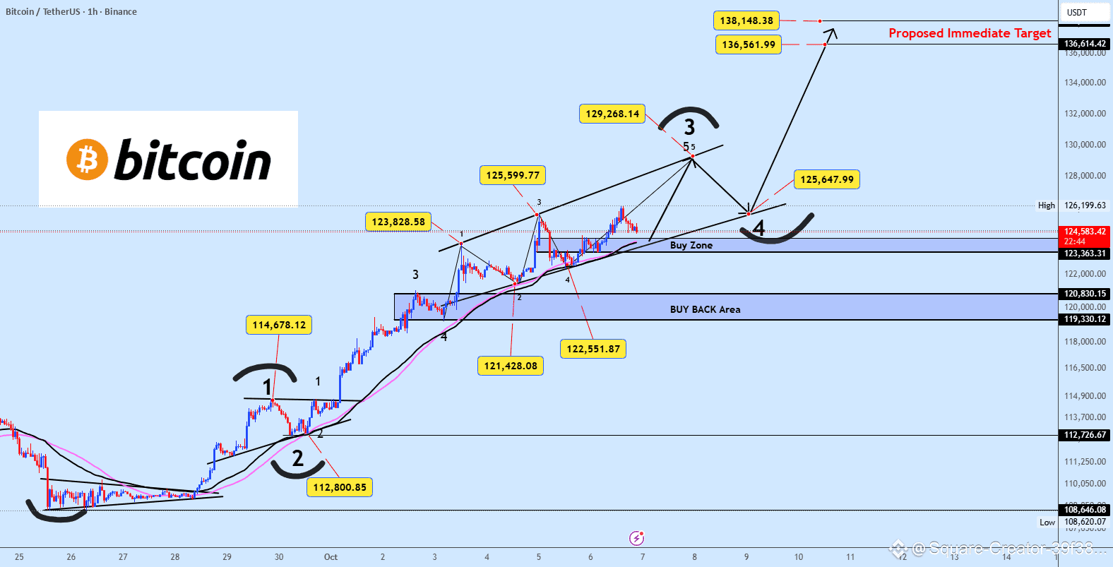 • ارتداد من منطقة BB الحالية → دفع لإكمال الموجة 3 عند $129K-$130K