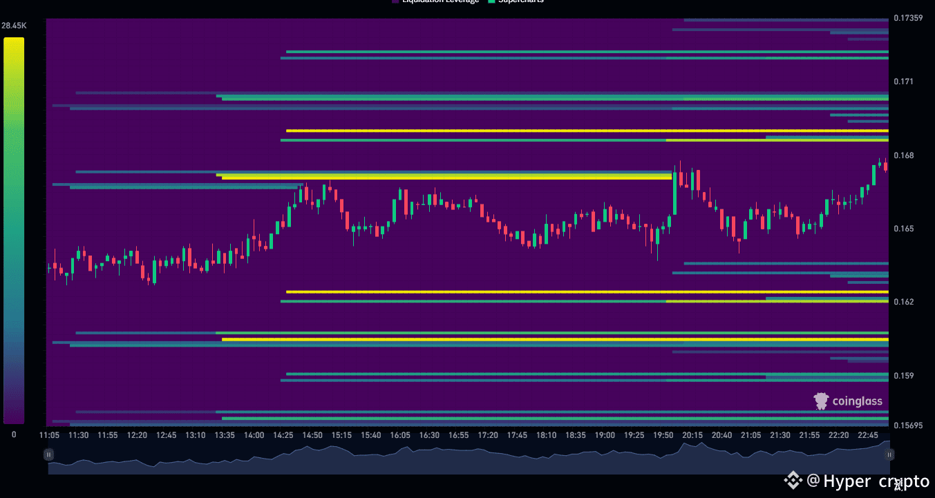 I can see on YGG liquidation heatmap yellow zones 🟡 represent high liquidity or heavy liquidation clusters, meaning many stop losses or liquidation levels are placed there.Currently, price action is around $0.168 💰 and moving upward.