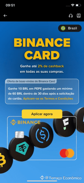 No aplicativo da Binance, vá até Menu > Binance Pay > Binance Card. Você verá uma tela de apresentação com os benefícios do cartão, incluindo o cashback e a oferta de boas-vindas.