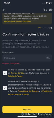 Na primeira etapa, você precisará informar sua renda anual e aceitar os Termos de Uso, a Tabela de Taxas, e as Políticas de Privacidade da Binance.