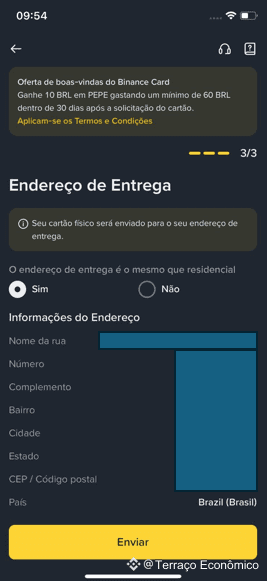 Esse será o local para envio do seu cartão físico, então confira tudo com atenção. Após revisar, toque em Enviar.