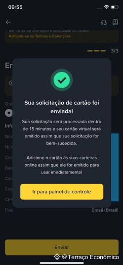 Segundo a Binance, a solicitação será processada em alguns minutos. Caso seja aprovada, seu cartão virtual será emitido imediatamente e poderá ser usado em carteiras digitais e compras online.