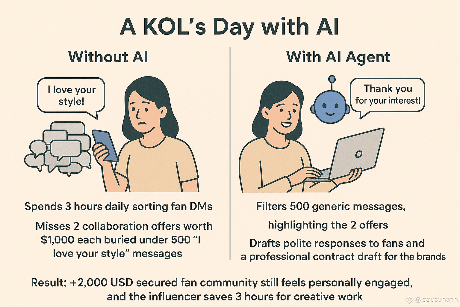 Result: +2,000 USD secured, fan community still feels personally engaged, and the influencer saves 3 hours for creative work.