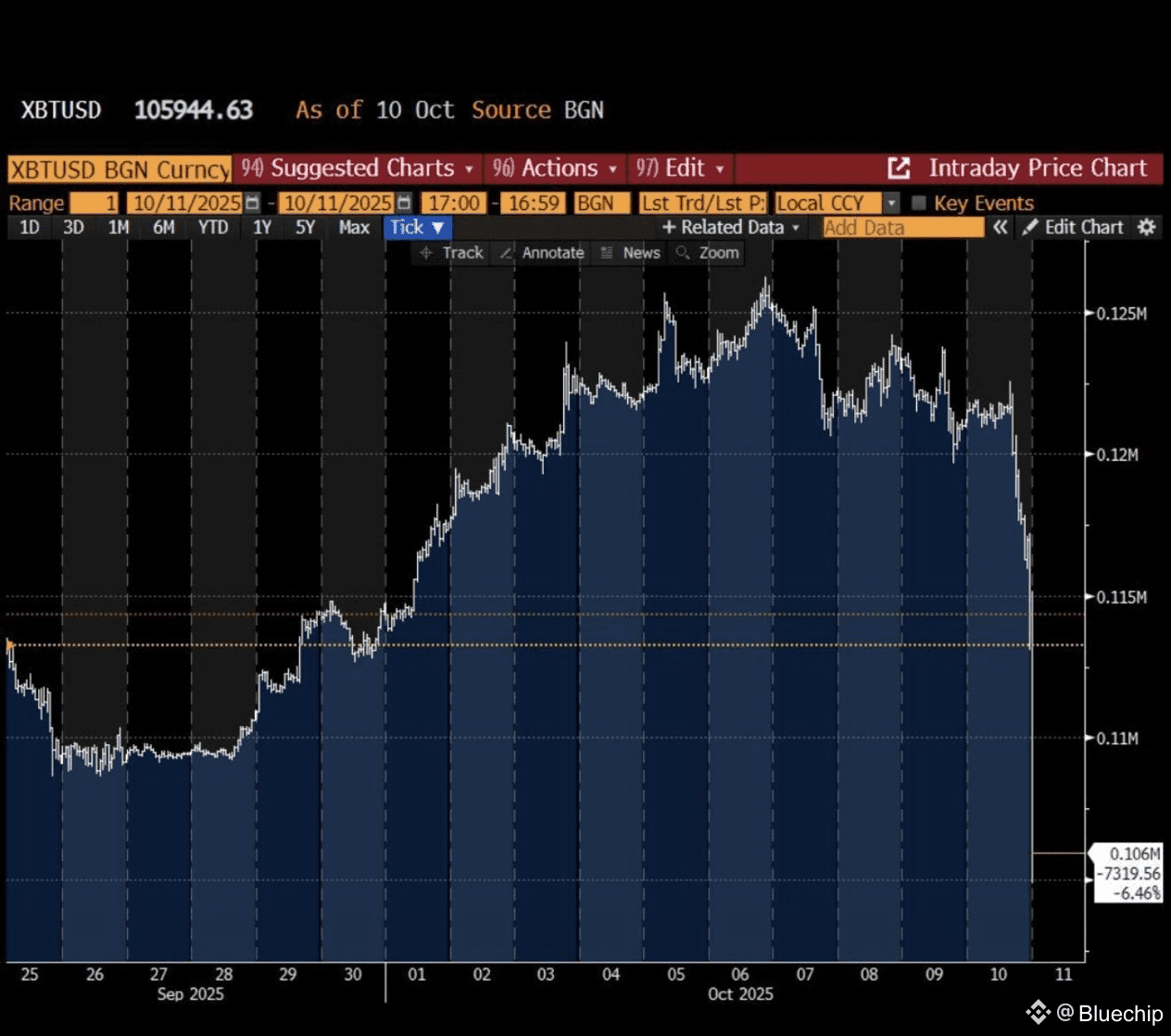 • With traditional markets closed for the weekend, the only open refuge was the crypto market — where Bitcoin plunged over 16% within minutes, dropping below $105,000, erasing all gains from September and October.