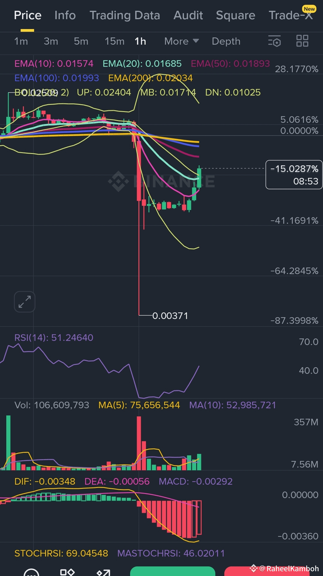 · Order Book: Massive bid walls at $0.017 and $0.016 show strong support, but thin resistance above suggests easy moves upward if buyers return.