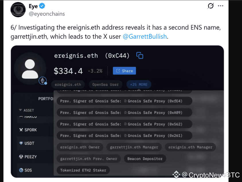 In a Saturday post on X, the onchain sleuth noted that the whale’s main wallet, ereignis.eth, was connected to another ENS name, garrettjin.eth, which directly leads to Jin’s verified X (Twitter) account, @GarrettBullish.