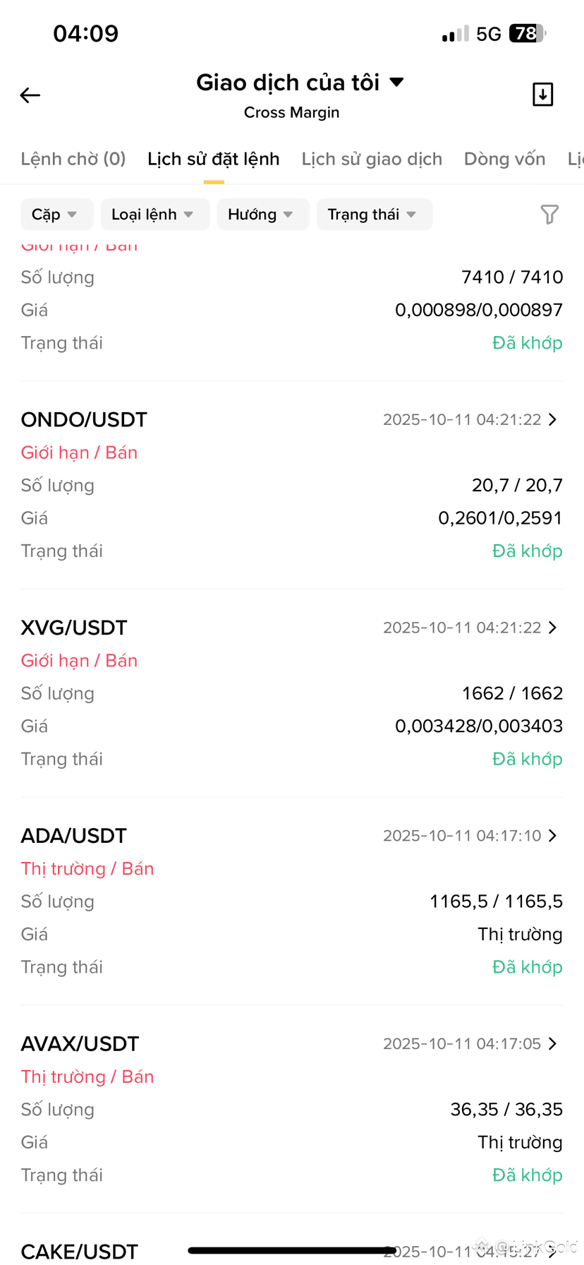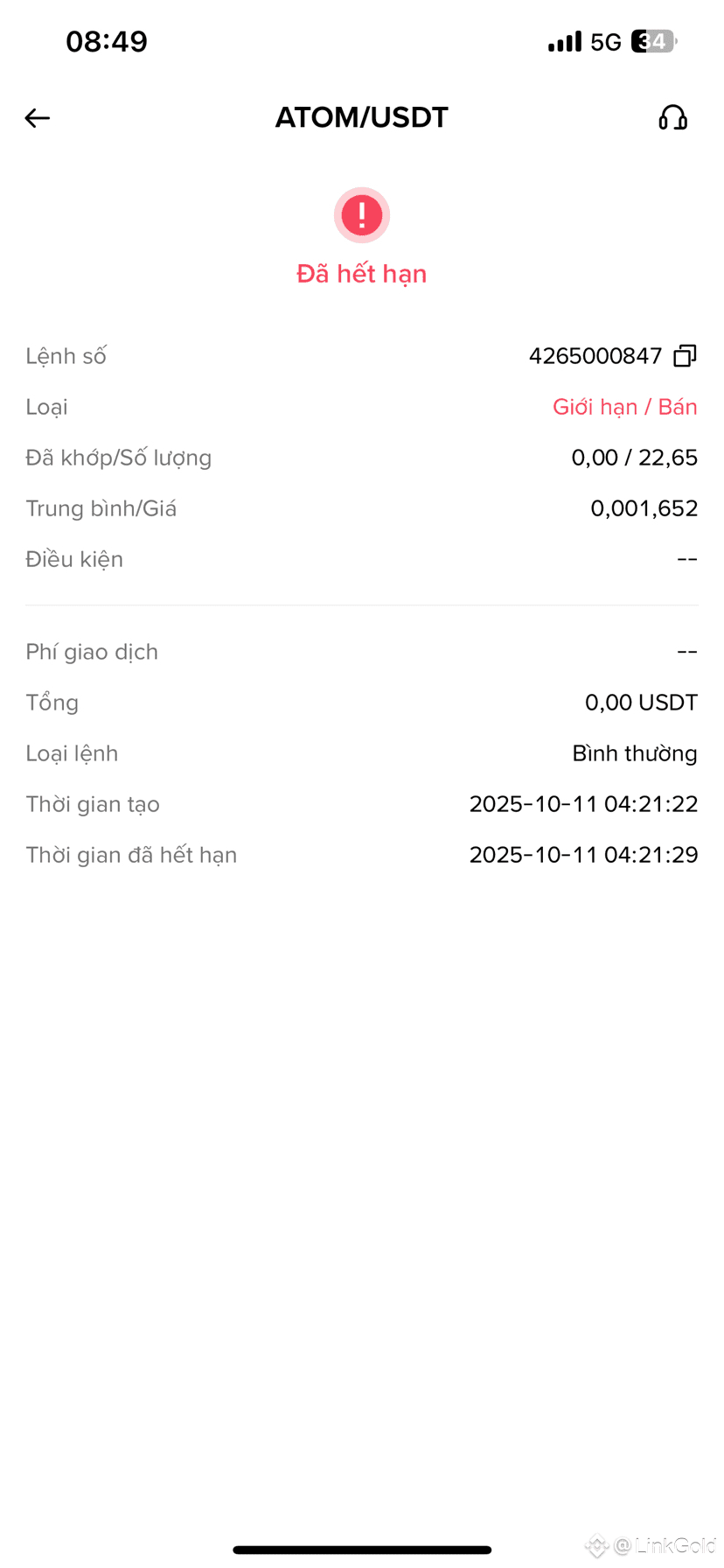 - Ảnh 1: 1 lệnh thanh lý ATOM ở giá 0.001652 lúc 04:21:22, tất nhiên lệnh này không thể khớp.