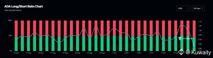 على جانب الاشتقاقات، فإن نسبة الرهانات الطويلة إلى القصيرة لعملة $ADA من CoinGlass، والتي تبلغ 0.81، هي أدنى قيمة لها منذ شهر. تعكس هذه النسبة، التي تقل عن واحد، المعنويات الهبوطية في الأسواق، حيث يراهن المزيد من المتداولين على انخفاض سعر الأصل.