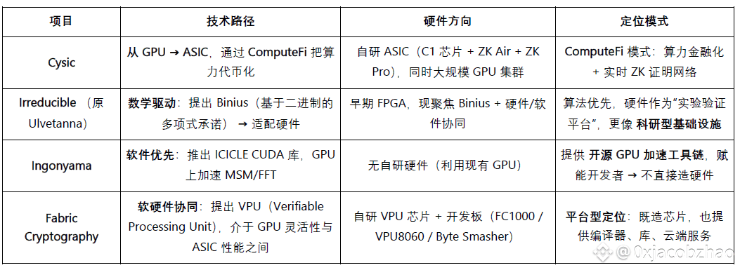 在硬件加速型 Prover 与 ComputeFi 赛道,Cysic 的核心对手包括 Ingonyama、Irreducible(前 Ulvetanna)、Fabric Cryptography、Supernational,均围绕“加速 ZK Proving 的硬件与网络”展开。