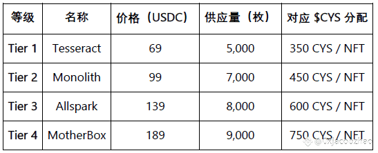 固定 Token 收益:每枚 NFT 锁定一定比例 $CYS 分配;