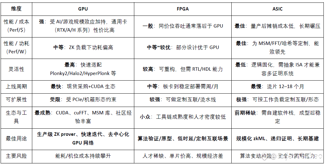 FPGA灵活方案:Paradigm 在 2022 年曾押注 FPGA,认为其在灵活性、效率与成本之间处于“甜蜜点”。FPGA 的确具备灵活可编程、开发周期短、硬件可复用等优势,适用于 ZK 证明算法迭代、原型验证、低延迟场景(高频交易、5G 基站)、功耗受限的边缘计算与高安全加密等任务。但在性能和规模化经济性上,FPGA 难以与 GPU、ASIC 竞争。其战略定位更接近“算法未定型时的验证与迭代平台”,以及少数细分行业中的长期刚需。