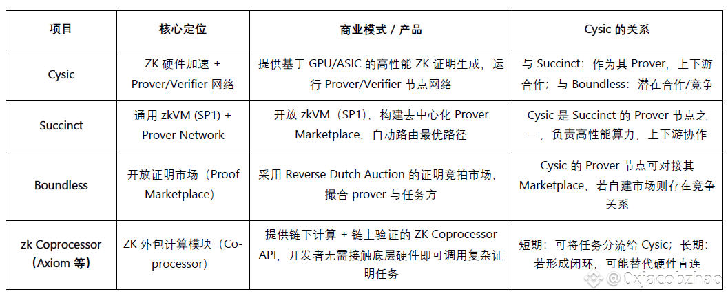 在 ZK Marketplace、Prover Network 与 zk Coprocessor 赛道,Cysic 当前更多扮演 上游算力供应商 的角色,而 Succinct、Boundless、Risc0、Axiom 等项目则通过 zkVM、任务调度和开放市场撮合切入同一客户群(L2、zkRollup、ZKML)。