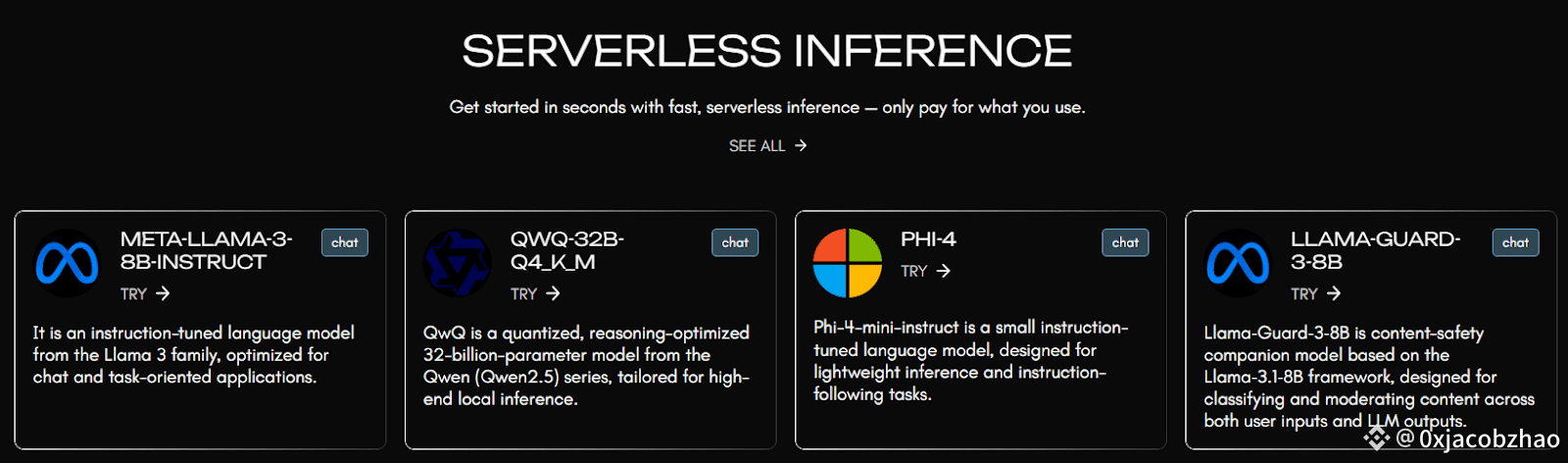 Cysic AI推出即开即用、按需计费的标准推理服务,用户无需自建或维护算力集群,即可通过 API 快速调用多种主流大模型,实现低门槛的智能化接入。当前支持的模型包括 Meta-Llama-3-8B-Instruct(任务与对话优化)、QwQ-32B(推理增强型)、Phi-4(轻量化指令模型)、以及 Llama-Guard-3-8B(内容安全审查),覆盖通用对话、逻辑推理、轻量部署与合规审查等多元需求。该服务在成本与效率之间取得平衡,既满足开发者快速原型搭建,也能支撑企业级应用的规模化推理,是 Cysic 构建可信 AI 基础设施的重要一环。