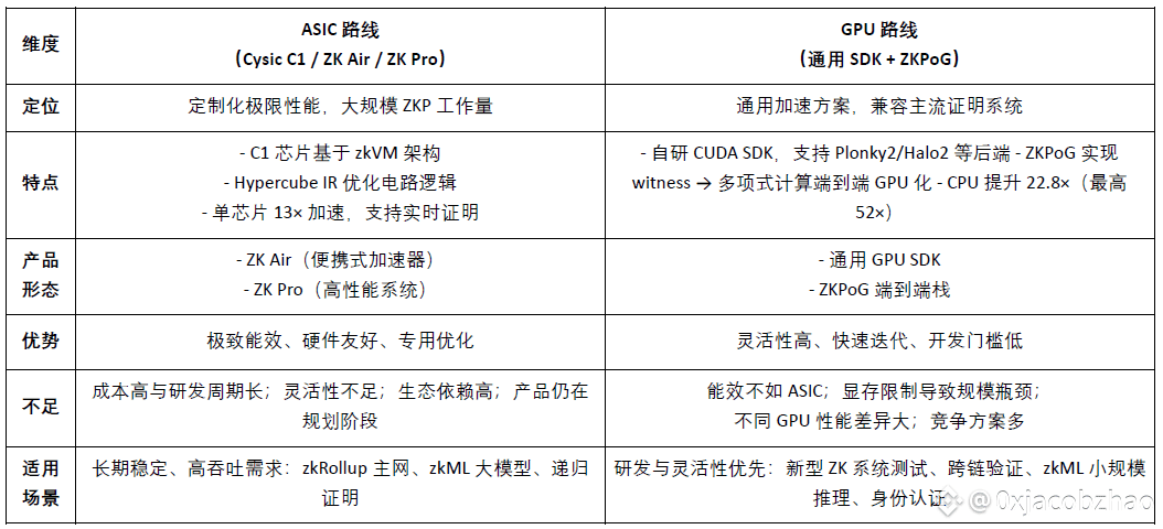 Cysic 的核心优势在于 零知识证明(ZK)的硬件加速。在代表性论文 《ZK Hardware Acceleration: The Past, the Present and the Future》 中,团队指出 GPU 具备灵活性和成本效率,而 ASIC 在能效和极致性能上更胜一筹,但需权衡开发成本与可编程性。Cysic 走 ASIC 创新 + GPU 加速 双线并进的路线,从定制芯片到通用 SDK,推动 ZK 从“可验证”走向“实时可用”。