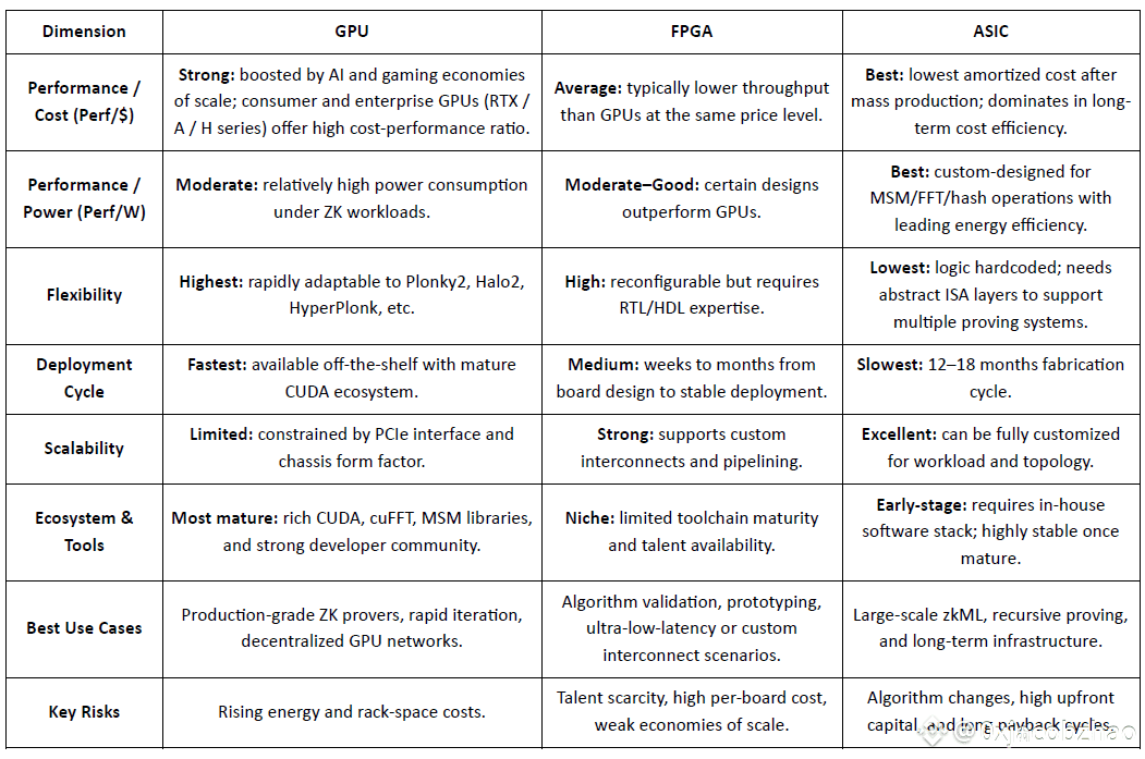 In the representative paper “ZK Hardware Acceleration: The Past, the Present and the Future,” the team highlights that GPUs offer flexibility and cost efficiency, while ASICs outperform in energy efficiency and peak performance—but require trade-offs between development cost and programmability.