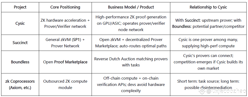 In ZK Marketplaces, Prover Networks, and zk Coprocessors, Cysic currently acts more as an upstream compute supplier, while Succinct, Boundless, Risc0, Axiom target the same end customers (L2s, zkRollups, zkML) via zkVMs, task routing, and open markets.