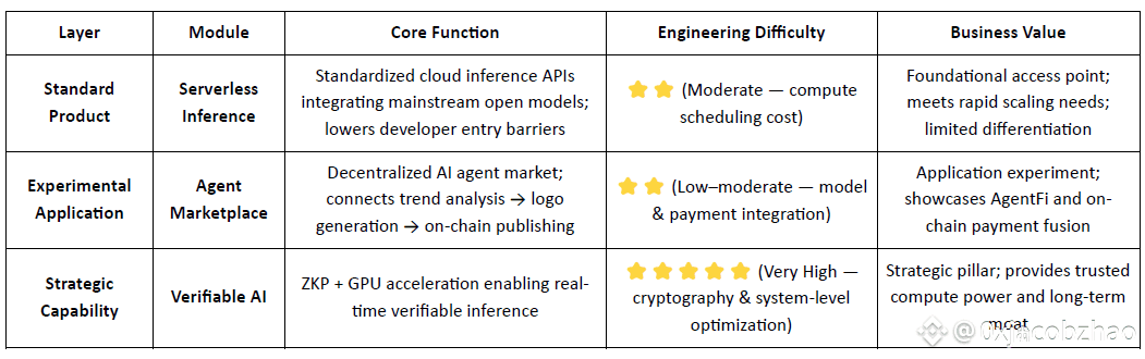 Cysic AI’s business framework follows a three-tier structure — Product, Application, and Strategy: At the base, Serverless Inference offers standardized APIs to lower the barrier for AI model access; At the middle, the Agent Marketplace explores on-chain applications of AI Agents and autonomous collaboration; At the top, Verifiable AI integrates ZKP + GPU acceleration to enable trusted inference, representing the long-term vision of ComputeFi.