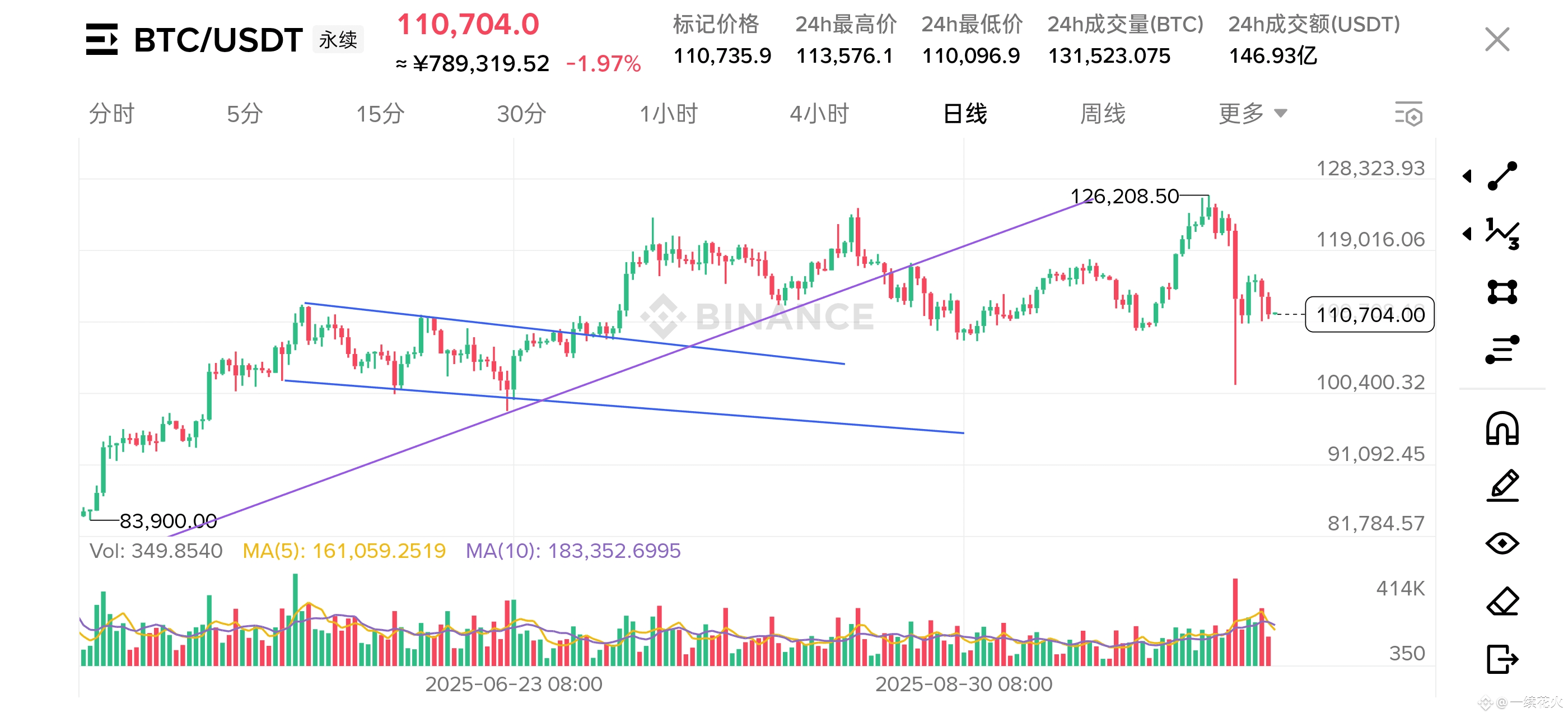 图表呈现“长期上升(Markup)→高位跳水回调”的结构:从83,900启动的上升趋势(符合Markup(上升阶段)特征,前期有低位震荡吸筹的铺垫),冲高至126,208.50后出现“瀑布式”回调,当前处于上升趋势后的深度调整阶段,需警惕是否进入Distribution(派发)初期(因回调力度大且破坏了趋势结构)。