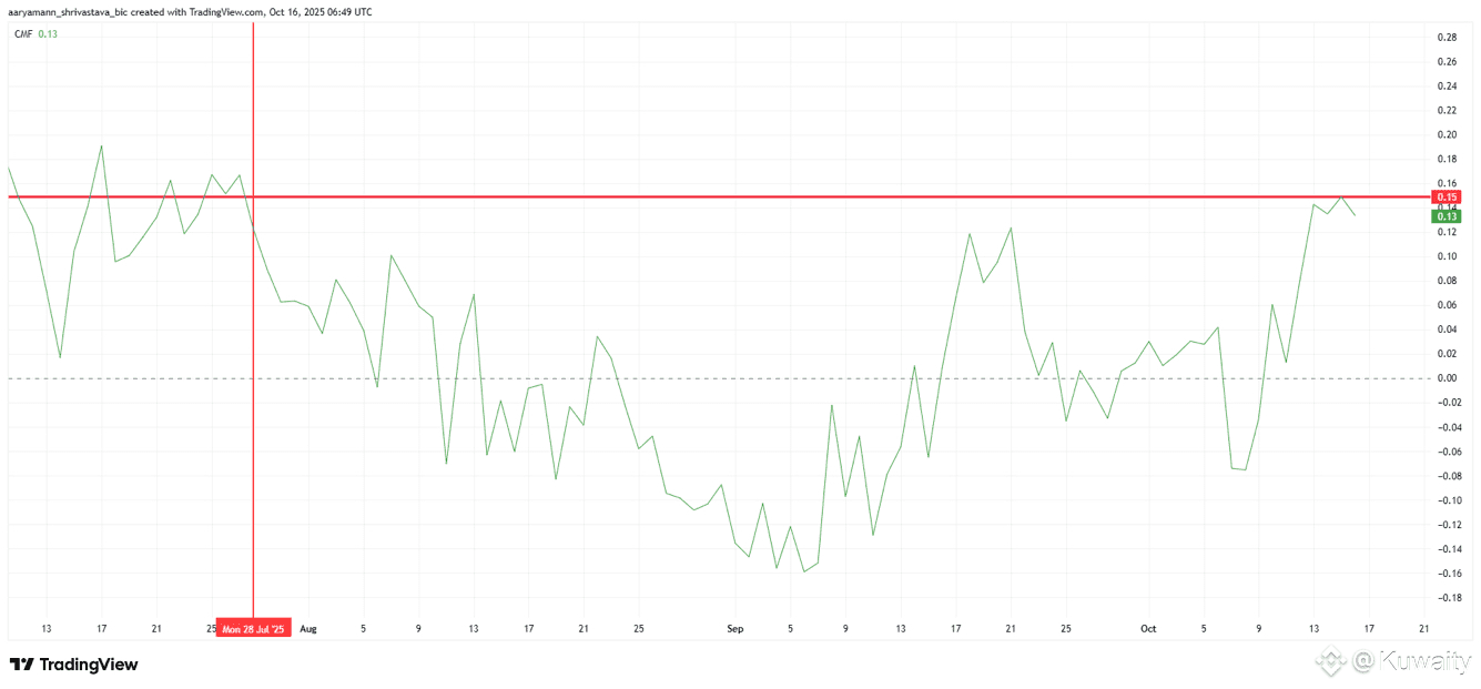 مؤشر تدفق المال تشايكين (CMF) لكاردانو يظهر زيادة حادة، مما يشير إلى تدفقات قوية من رأس المال إلى الأصل. حاليًا عند أعلى مستوى له في ثلاثة أشهر، يشير هذا إلى أن المستثمرين يشترون ADA بنشاط بأسعار مخفضة بعد انهيار السوق. تاريخيًا، تشير مثل هذه الارتفاعات في CMF إلى مراحل تجميع متجددة غالبًا ما تسبق التعافي.